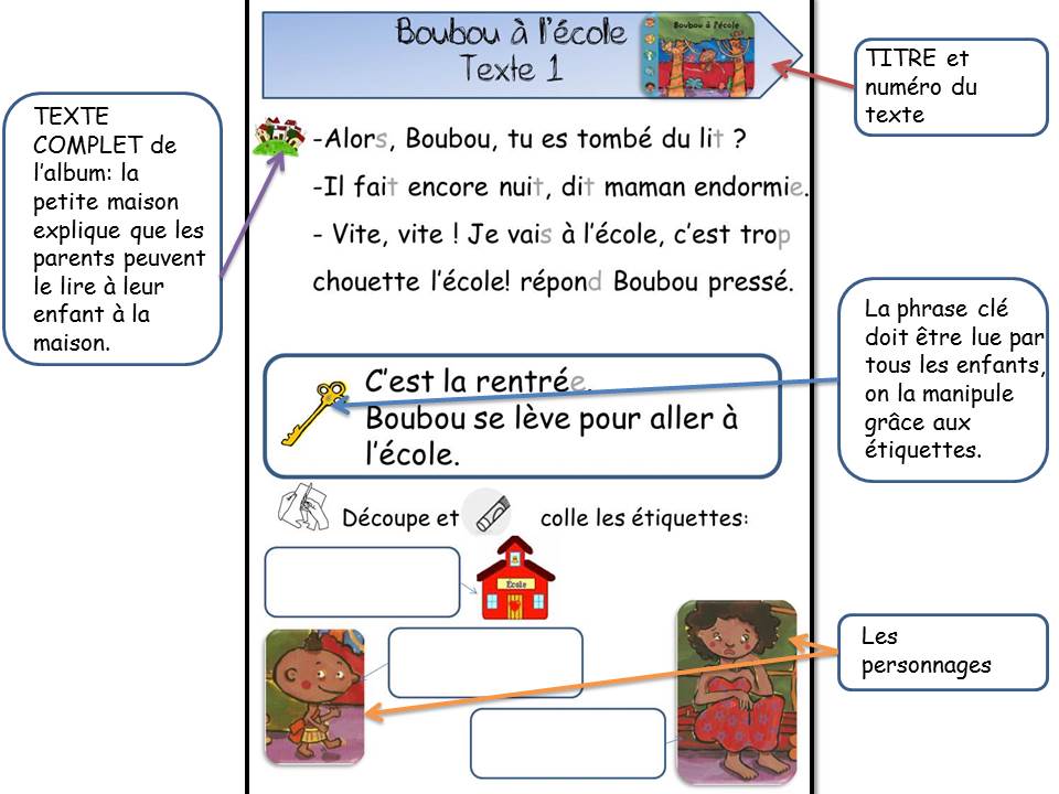 Sur la page de lecture, il y a le texte en entier qui peut être lu à la maison par les parents ou par les enfants qui peuvent parfois être déjà lecteurs. Ensuite, une phrase avec une clé est sélectionnée et doit être lue par tout le monde. En général, les mots de cette phrase sont mis sur étiquette, ce qui permet de faire des manipulations en classe et à la maison.Toutes les étiquettes sont plastifiées et mises sur les feuilles de couleur différente.